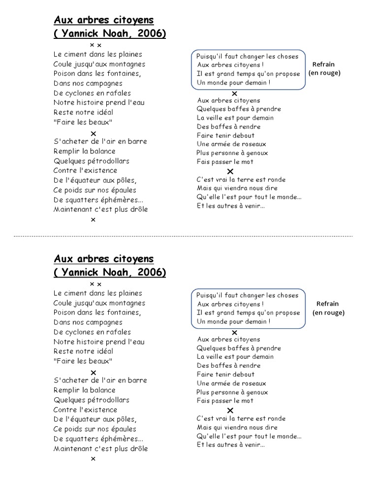 . Il est grand temps quon propose Un monde pour demain. Aux Arbes Citoyens - Yannick Noah - Les paroles de la chanson Le ciment dans les plaines Coule jusquaux montagnes Poison dans les fontaines Dans nos campagnes De cyclones en. 3ème chanson de lalbum charango de yannick noah 2006 Aux arbres citoyens yannick noah 2006 le ciment dans les plaines coule jusquaux montagnes poison dans les fontaines dans. Il est grand temps quon propose Un monde pour demain.
